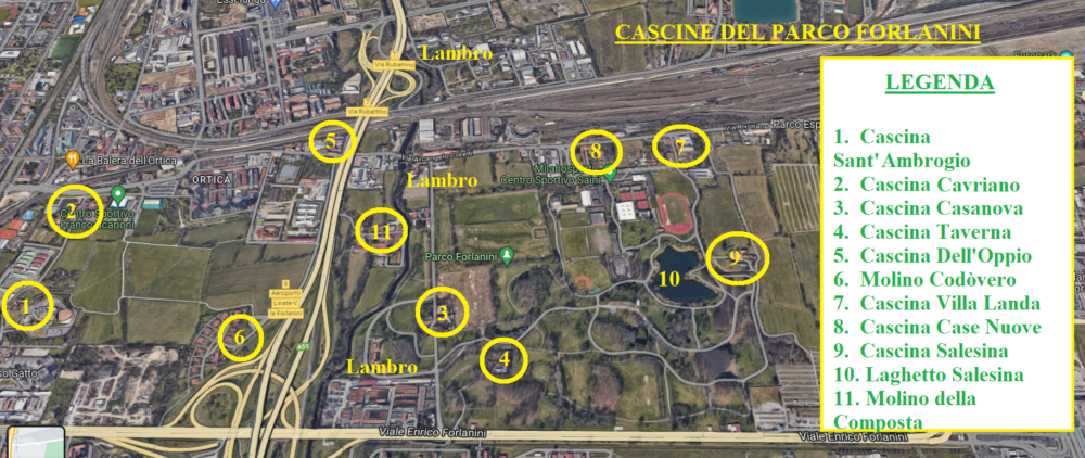Questo testo si propone di esaminare tutte le cascine site all’interno del Parco Forlanini. Naturalmente questo raggruppamento non ha ragione storica poiché il Parco Forlanini, come penso sia noto, venne realizzato negli anni 1967-70 su progetto degli architetti Cesare Mercandino e Mario Beretta con l’idea di creare un grande spazio verde per l’utilizzo sportivo e ricreativo. Inizialmente avrebbe infatti dovuto coprire un’area di circa 2.500.000 mq e contenere anche piscine e campi da hockey, ma la realizzazione dell’aeroporto di Linate ne ridusse le dimensioni a 750.000 mq