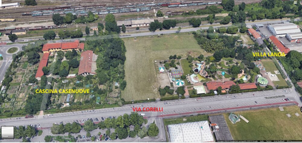 Passiamo infine ad occuparci delle due cascine poste a nord del Parco Forlanini, lungo la via Corelli, ed iniziamo con la Cascina Villa Landa, che forse era in origine un borgo medievale denominato Villa Adrado nel 1170, Villadelardi nel 1212, scomparso con la chiesa di Sant’Antonino, ivi citata alla fine del Duecento. Sita al civico 142 della via, Villa Landa risulta già nella mappa della Pieve di Segrate del 1569 e nella successiva carta seicentesca del Claricio. Il catasto teresiano la raffigura di fianco alla cascina Case Nuove (di cui parleremo tra poco) tra una distesa di prati. La proprietà è costituita da due corpi ad L (uno dei quali di dimensione maggiore rispetto all’altro) che si affacciano su aree di pertinenza distinte, separate dalla via Salesina ed oggi appartenenti a due diverse proprietà.