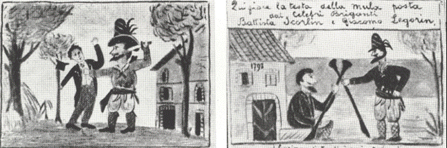 La Cascina Merlata di Via Gallarate, restaurata in occasione dell’Expo 2015 ce ne tramanda con il nome il ricordo. I due banditi, catturati insieme a numerosi complici e rei di un numero imprecisato di omicidi, vennero processati e infine giustiziati nel maggio del 1566 e il testo che ne documenta per l’appunto il processo, riporta inoltre fedelmente la relazione fatta dal cavaliere del capitano di giustizia Giulio Modena a Pietro Giorgio Visconte, segretario del Senato di Milano in merito allo spietato supplizio e alla esecuzione dei due condannati. Non possiamo sapere se anche precedentemente all’edizione del Mazzucchelli, fosse così vivo a Villapizzone il ricordo delle gesta dei due banditi ma certamente possiamo immaginare che, quantomeno, la riproposizione della storia ne possa avere rinfocolato la memoria. E’ infatti alla seconda metà del Settecento che venivano fatti risalire i due affreschi di gusto popolaresco che decoravano le murature della vecchia osteria. Il primo affresco rappresentava una aggressione posta in essere da un bandito pittorescamente agghindato con cappellaccio, stivali, cintura, ritratto nel momento in cui stava per colpire con un pugnale un viandante, in un contesto ambientale caratterizzato da alcuni alberi e una cascina. Il secondo, con la data di esecuzione dell’opera, 1793, ben evidenziata sul muro della casa dipinta, rappresentava invece due banditi che incrociavano i loro tromboni, a mo’ di giuramento. Sotto di loro una scritta, in un italiano simpaticamente zoppicante, recitava: “Giuriamo di tradirci mai più” mentre nella parte superiore della pittura un’altra scritta recitava “Qui giace la testa della mula posta dai celebri briganti Battista Scorlin e Giacomo Legorin”.
