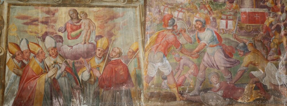 L’affresco di destra ritrae San Carlo Borromeo (il cui ritratto è preso dal vero) tra i Santi Vescovi in contemplazione della Vergine con in braccio Gesù Bambino, che domina al centro; quello di sinistra rappresenta invece una battaglia, di cui ci fu una interpretazione secondo cui era la battaglia della Bicocca (intorno al 1500, teatro di una famosissima vittoria degli Spagnoli), mentre quella corrente fa riferimento alla battaglia di Legnano avvenuta nel 1176, in particolare all’episodio in cui le tre colombe, partite dalla tomba dei tre martiri dell’Anaunia sita nella Basilica di San Simpliciano, si posarono poi sul carroccio dei cavalieri della Lega lombarda, incoraggiando la loro vittoria.