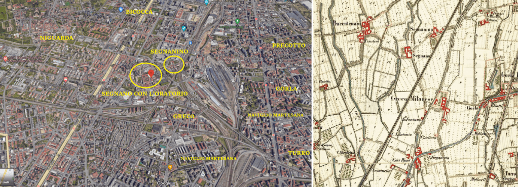 Il segnalino rosso a destra marca la posizione dell’oratorio di Segnano, sopravvissuto all’interno di una vastissima area completamente cementificata. A destra, una mappa militare del XIX secolo mostra la precedente estensione agricola, cosa che giustifica un oratorio rurale nel borgo di Segnano, il passaggio della ferrovia a Segnanino e del naviglio Martesana a Gorla, la numerosa presenza, a rete, di grandi fontanili (oggi scomparsi)