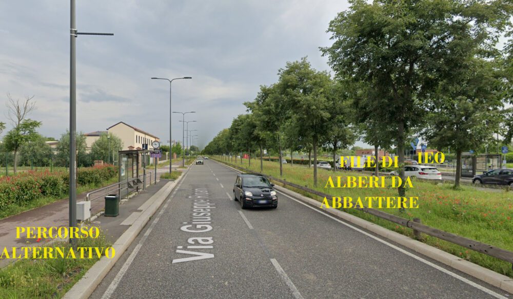 SOMMARIO Il progetto prevede di prolungare il capolinea fino allo IEO abbattendo circa 120 alberi, tra l’altro sistemati da poco. Per evitare un simile sproposito, frettoloso, l’Associazione Antichi Borghi Milanesi, ABM, propone due alternative: o di far passare il nuovo tracciato alle spalle dello IEO, sfruttando la stradina utilizzata anni fa per giungere a Macconago e sita alle spalle dello IEO (indicata in giallo nella cartina allegata qui sotto), oppure di utilizzare allo scopo le due piste ciclabili esistenti ai lati, ricostruendole al centro del parterre sotto gli alberi