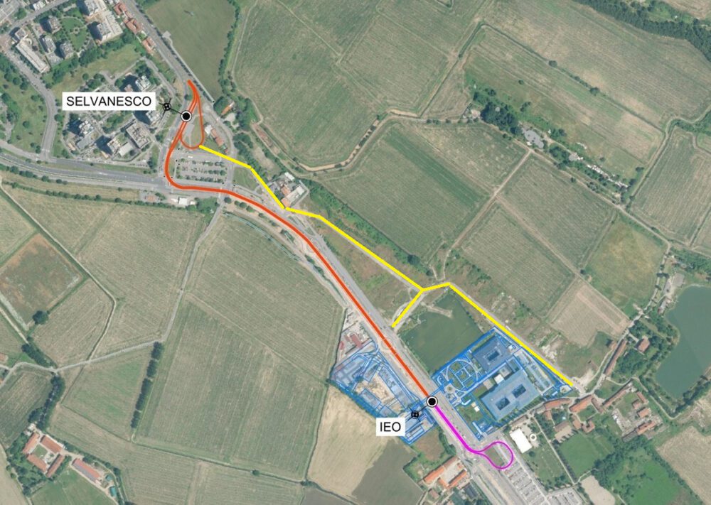 In rosso il nuovo percorso del tram 24, in giallo quello alternativo proposto da ABM, che passa alle spalle dello IEO