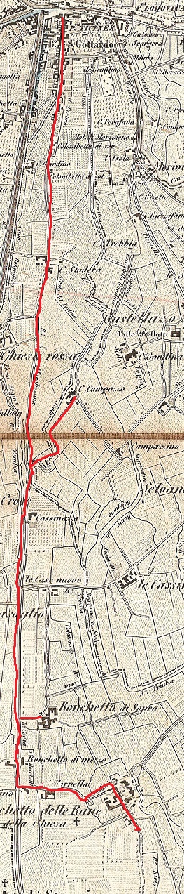 Infine, una deviazione a sinistra ci avrebbe invece condotto, superata cascina Fornella, al Ronchetto delle Rane, detto anche ”della Chiesa”: questa deviazione non è mutata nel tempo, come pure il bellissimo borgo di Ronchetto, ove è stato inserito solo un edificio che vorrebbe richiamare una cascina, mentre al di fuori dell’abitato sono state costruite villette di dimensioni contenute per non  turbare l’omogeneità del luogo.
