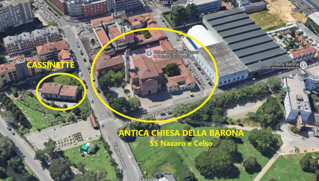 Poche centinaia di metri più avanti ci saremmo trovati nel centro del borgo della Barona, e giunti su un incrocio la strada sulla destra ci avrebbe condotti allo scomparso Molino Blondelli, che sorgeva sulla roggia Carlesca, una delle più importanti della zona sud, mentre prendendo a sinistra, e passando davanti al cimitero del borgo, saremmo giunti alla chiesa (quella odierna è l’ampliamento tardo-ottocentesco della chiesa costruita nel XVI secolo, che a sua volta aveva sostituito una chiesina del XIV secolo e che funse da parrocchiale dal 1567) con le vicine cascinette, tuttora visibili sulla sinistra della chiesa.