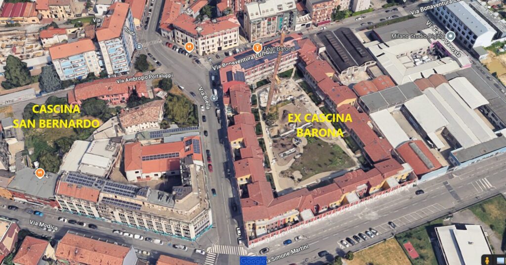 Il centro rurale però ci avrebbe atteso pochi metri più avanti, oltre la chiesa, sulla odierna via Zumbini, ed era costituito primariamente da due cascine: la grande cascina Barona e la cascina San Bernardo. Di queste, la prima è stata abbattuta un paio di anni fa per essere sostituita da un complesso residenziale (ora in costruzione), mentre la seconda è tuttora visibile, seppure degradata, in via Binda: per giungervi, oggi come allora, occorre svoltare a destra alla fine di cascina Barona e poi a sinistra in una strada senza uscita. Svoltando a sinistra, invece, e costeggiando il lato ovest della cascina Barona (attuale via Biella), saremmo andati al borgo rurale di Boffalora (omonimo di quello sullo Strettone) e indi alle cascine Battivacco e Colomberotto, tuttora immerse tra le risaie dell’omonimo Parco.