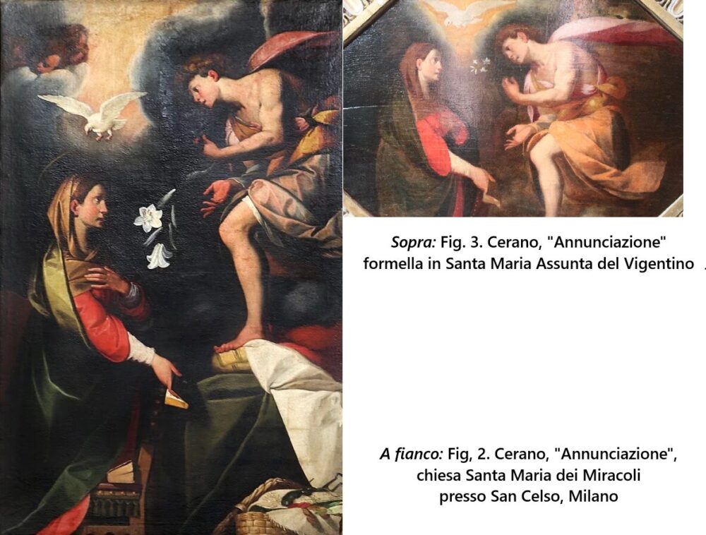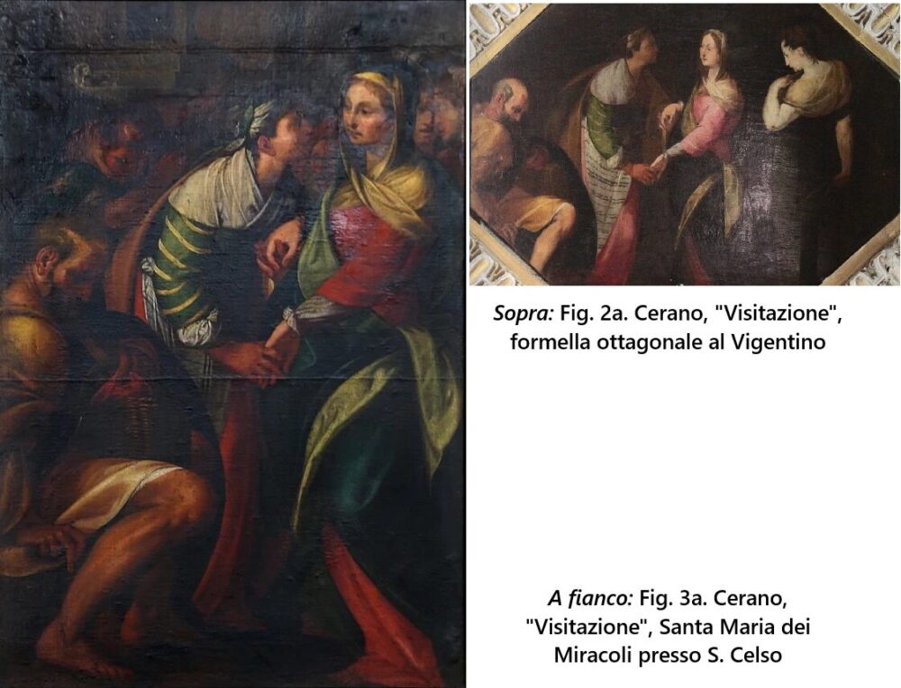 Giovanni Testori paragona poi due gruppi di opere giovanili di soggetto simile: ‘L’Annunciazione’ (dipinta tra il 1590 e il 1595) e ‘La Visitazione’ (del 1606) costituiti da due tempere poste nella sacrestia di S. Maria presso San Celso (figg.2-2a) e il secondo gruppo appartenente ai ‘Misteri Gaudiosi’ allestiti nella chiesa del Vigentino (figg.3-3a). La sintesi di Testori: “Poiché tutto induce a ritenere che i due gruppi, quello di S. Maria presso S. Celso e quello dell’Assunta del Vigentino, si distanzino di pochissimo tempo, un anno o due al massimo, ci si offre qui la possibilità di cogliere nella fase iniziale, e per giunta su uno stesso tema, la duplice vocazione del Cerano, quella della poesia ‘privata’, su cui più premettero le sollecitazioni delle ‘maniere’ cinquecentesche, e quella della poesia ‘corale’, su cui più premette la tradizione gaudenziana; duplice vocazione che se di sovente procederà divisa, di tanto in tanto si unirà a creare le opere più alte e nella loro folta complessità, più umanamente laceranti”. E prosegue: “E si sa che il Cerano, tra il ‘90 e il ‘95, con queste opere è appena agli inizi: le dipendenze continueranno ancora per qualche anno, così come i riporti e i ricuperi.”