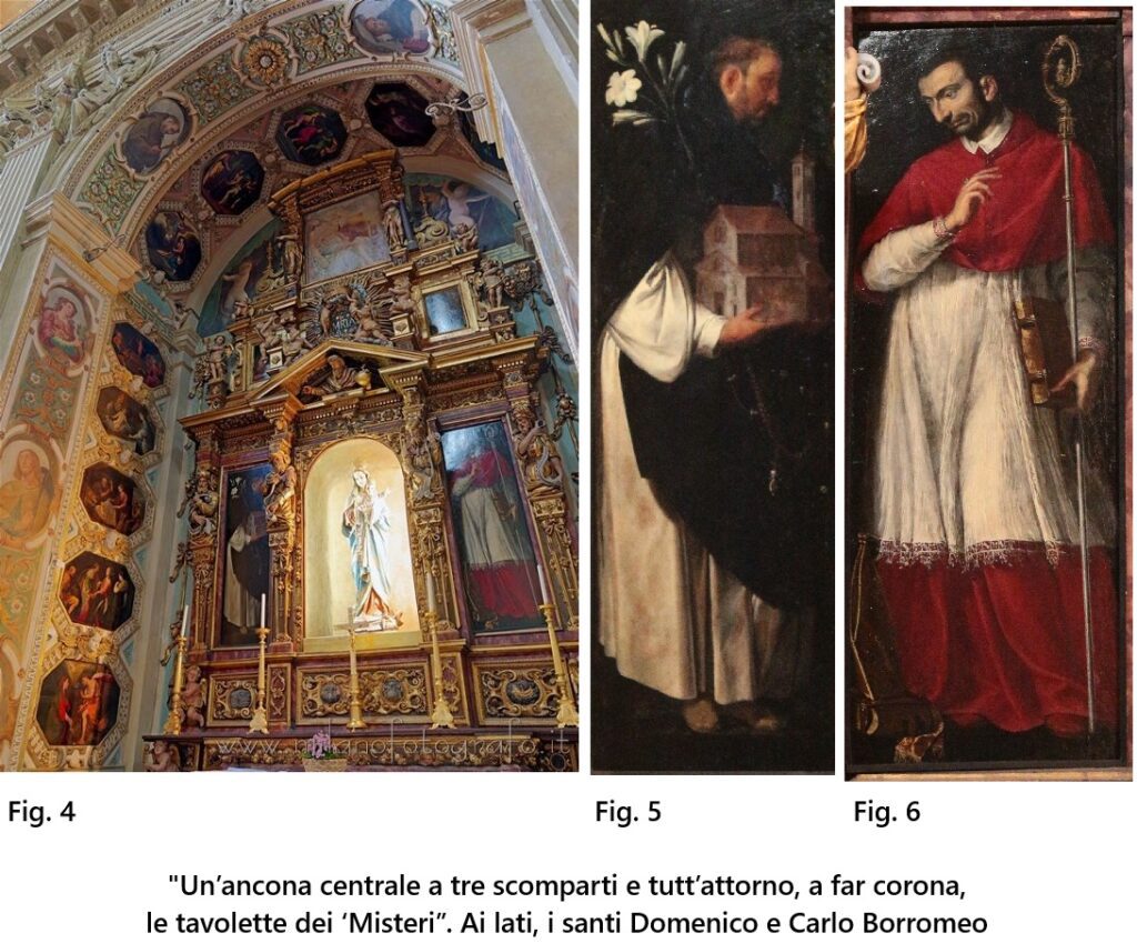 E veniamo alle opere del “Cerano Giovine” considerate più importanti dal Testori, sempre presenti nella chiesa dell’Assunta al Vigentino: “Quale doveva essere in origine il ciclo, di cui pubblichiamo qui i particolari di miglior conservazione, non è difficile immaginare: un’ancona centrale a tre scomparti e tutt’attorno, a far corona, le tavolette dei ‘Misteri” (fig.4). Difficile invece provare se il simulacro centrale, cui pure si dovevano rivolgere i santi Domenico e Carlo (figg.5-6), simulacro che venne sostituito nel Settecento con una scultura in legno, “fosse anch’esso una pittura ovvero una scultura”.