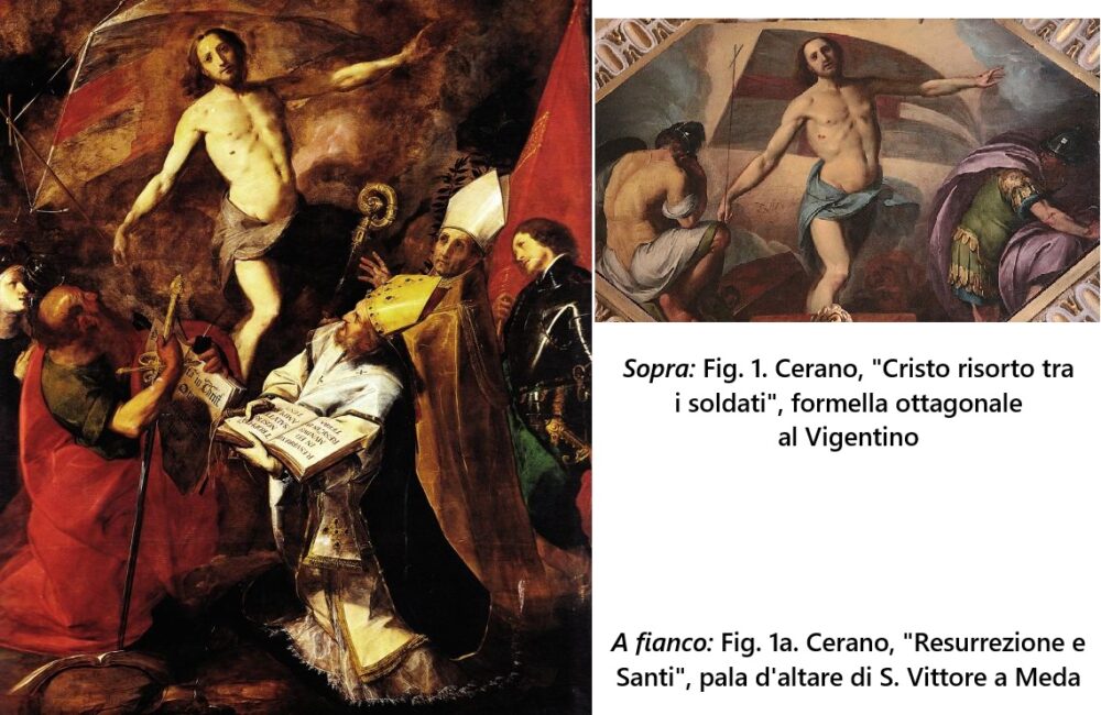 E prosegue così: “…Per restare con la nostra ancona nel Vigentino, in una tavoletta dei Misteri del Rosario, quella gloriosa della ‘Resurrezione (fig.1) ecco l’idea prima e di timbro ancor fiorentino-tibaldiano, che si realizzerà in pienezza solo nel 1625, con la ‘Pala’ di S. Vittore in Meda” (fig.1a).