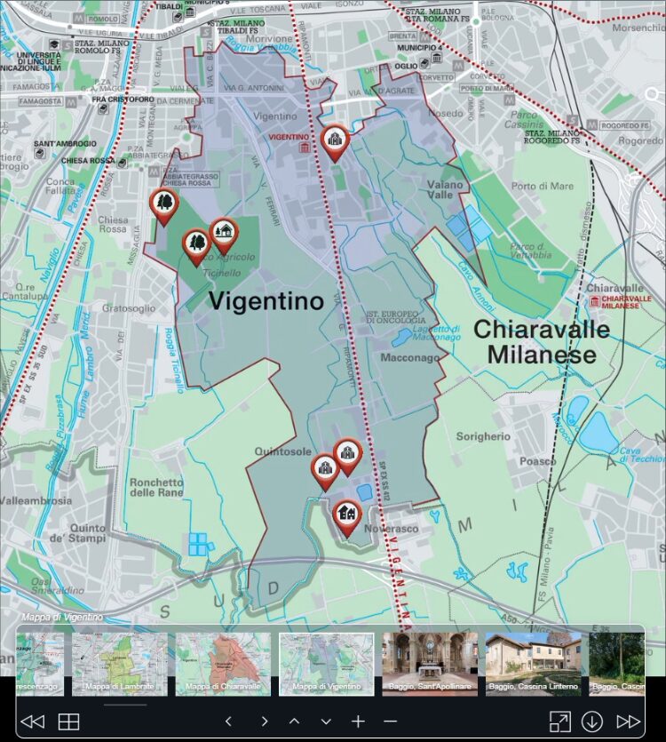 Gli utenti possono immergersi in modo semplice e intuitivo tra i meravigliosi affreschi della Certosa di Milano e gli stalli del coro della millenaria Abbazia di Chiaravalle; passeggiare a Crescenzago, Gorla e Greco lungo il Naviglio Martesana tra antiche ville, borghi storici e monumenti; attraversare gli ampi spazi del Parco di Villa Litta Modignani ad Affori, con i suoi platani secolari e i suoi eleganti elementi architettonici; percorrere i vicoli acciottolati di Baggio che, insieme a Trenno, conserva ancora intatta l’anima rurale lombarda con cascine, fontanili e marcite.