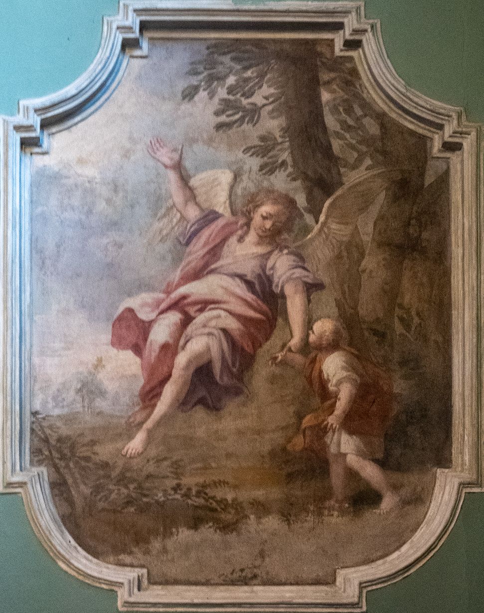 Il primo a destra raffigura L’angelo custode che tiene per mano un bambino collocati in un paesaggio boschivo caratterizzato dalla presenza di un grande albero. L’angelo, in ampia veste rosata, è in volo, con una mano tiene il braccio del bambino, che lo guarda attentamente, mentre la destra addita al cielo. Dalla destra più scura, il colore è rischiarato dalla luce verso sinistra in corrispondenza del braccio alzato dell’angelo. L’iconografia dell’angelo custode, diffusasi in particolare dopo il Concilio di Trento, prende spunto dall’episodio biblico dell’arcangelo Raffaele guida al giovane Tobia (libro di Tobia).