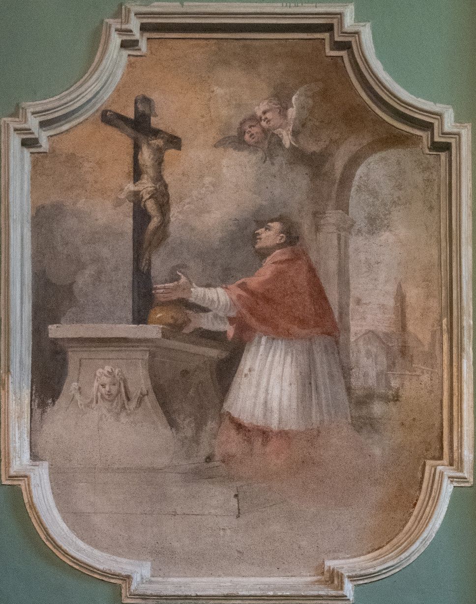 Ultimo affresco della parete destra è San Carlo Borromeo in preghiera davanti al crocifisso. Il santo, in abito cardinalizio con la corta mantellina rossa, l’ampio camice bianco che copre la porpora cardinalizia è in un interno non ben precisato, forse una cappella, inginocchiato ai piedi di un altare, il fianco è decorato con un mascherone, in supplice preghiera davanti a un crocefisso circonfuso di luce (analogo a quello della scena della Maddalena e probabilmente un oggetto presente nella bottega del pittore). Il santo guarda verso il crocifisso, ha le braccia allagate che esprimono una intensa preghiera di supplica. In alto due angioletti, segno della presenza del Divino, guardano anch’essi il crocifisso. L’ambiente in cui si trova il santo si apre all’esterno grazie a un grande arco oltre il quale si nota una chiesa con facciata romanico-gotica e un alto campanile. La precisazione della descrizione ci fa supporre si tratti di una chiesa reale e non di invenzione, chiesa che si ritrova anche nella scena con san Francesco.