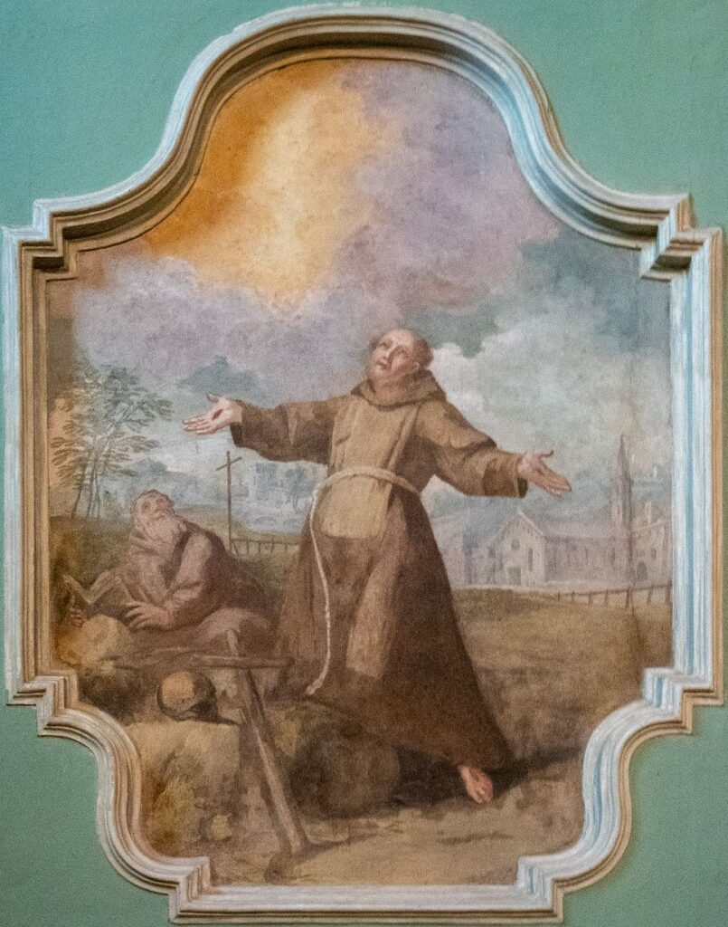 Accanto troviamo San Francesco mentre riceve le stimmate.  Il questo caso l’ambientazione è spoglia, quasi desertica, tranne uno striminzito alberello a sinistra. Il santo, dal volto verso l’alto in estasi e le braccia allargate, è inginocchiato su un grosso sasso su cui si nota anche una rozza croce di legno e un teschio dal color terra, tanto che lo si potrebbe confondere con una pietra. Francesco veste un rozzo saio marrone con cappuccio, stretto in vita da una corda, ha i piedi nudi e accanto a lui, rapito dalla luce che si sprigiona in alto, notiamo un altro frate barbuto in lettura. Alle spalle dei due frati notiamo un paesaggio con una chiesa, pare la stessa dell’affresco con san Carlo, altri edifici e una lunga staccionata che divide la zona arida in primo piano dal paese sullo sfondo.