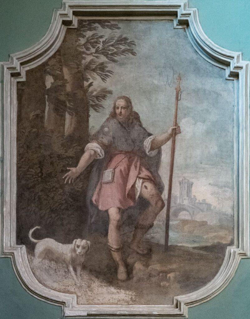 La sequenza dei dipinti della parete sinistra comincia con San Rocco.  Il santo si presenta in un paesaggio con alberi a sinistra e un ponte con una grande torre a destra. Porta i consueti abiti da pellegrino: la corta mantellina con la conchiglia di Compostella, il bastone, la sacca e il cagnolino che secondo la pia tradizione lo aiuto portandogli il pane. Il santo con una mano tiene il bastone mentre l’altro braccio è aperto, quasi ad indicare il piccolo cane; bene in evidenza sulla coscia sinistra il segno della peste, motivo per cui fu uno dei protettori contro tale epidemia.