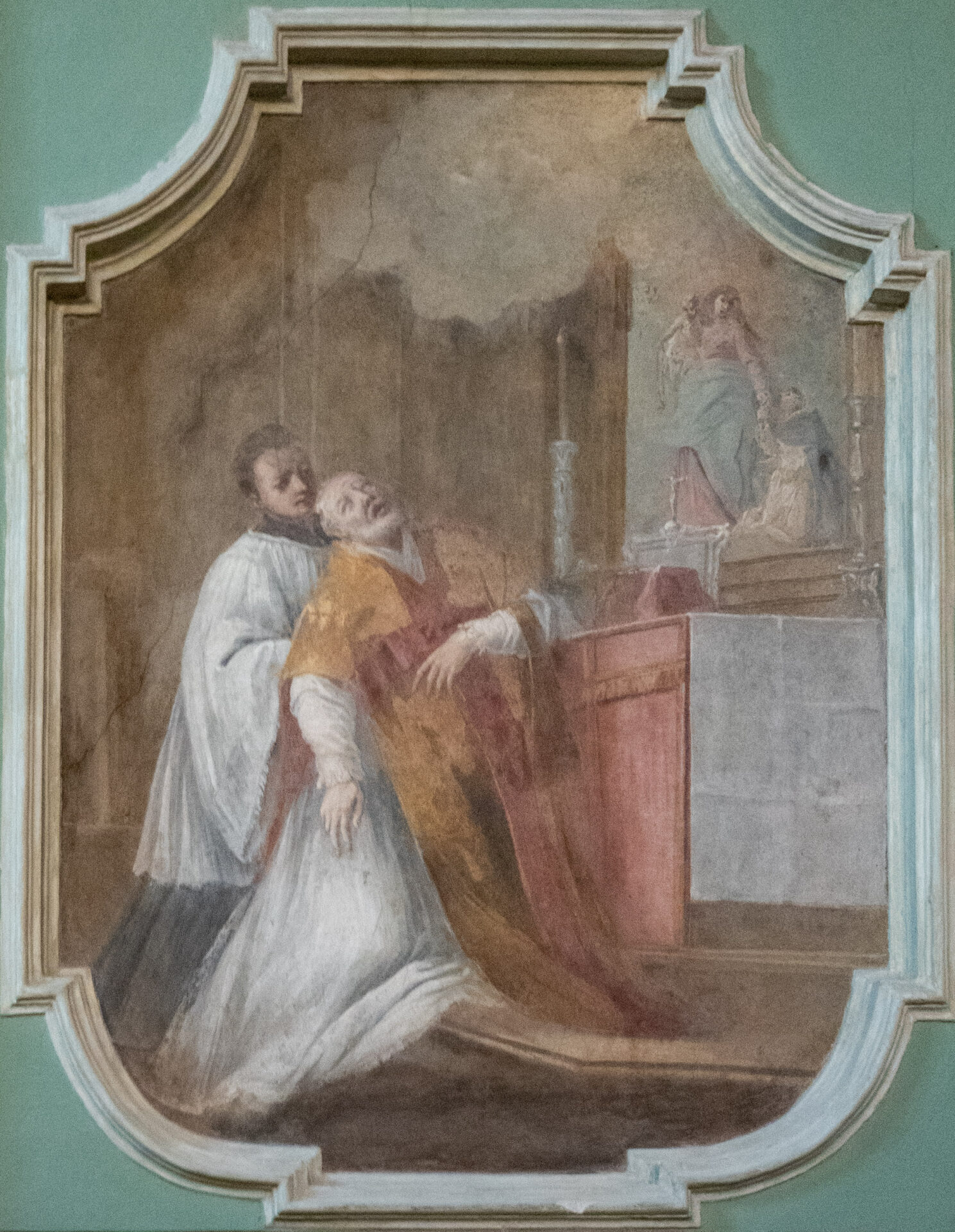 Da ultimo due ecclesiastici: Carlo Borromeo, colui che aveva favorito la nascita delle Compagnie della Croce, pastore, uomo di preghiera e uomo di penitenza; più ardua è la spiegazione della presenza di sant’Andrea Avellino. Avellino, chierico dei Teatini, che a Milano avevano convento in Sant’Antonio abate, venne canonizzato nel 1712, quindi pochi anni prima della realizzazione dei nostri affreschi. Il santo fu superiore anche a Milano ed ebbe uno stretto rapporto con Carlo Borromeo. Il santo viene sempre raffigurato durante la sua ultima messa, durante la quale fu colto da apoplessia che lo condusse alla morte, quasi un sigillo della sua vita morire all’altare.