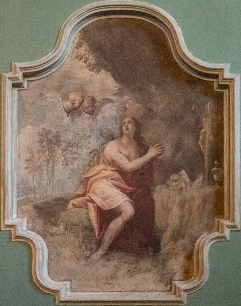 Accanto troviamo la Maddalena penitente; entro una grotta che sul fondo si apre in un arioso paesaggio, vediamo Maddalena in preghiera davanti a un crocifisso, sotto cui vi è un libro aperto e un vasetto, a ricordo degli aromi che portò alla tomba per imbalsamare il corpo del Signore. Il corpo formoso è coperto da un ampio panno rosato che fa appena intravedere la nudità della santa, segno della sua rinuncia ad ogni vanità terrena. Lo sguardo è volto verso l’alto, in estasi, le mani giunte, mentre due angioletti vigilano su di lei.