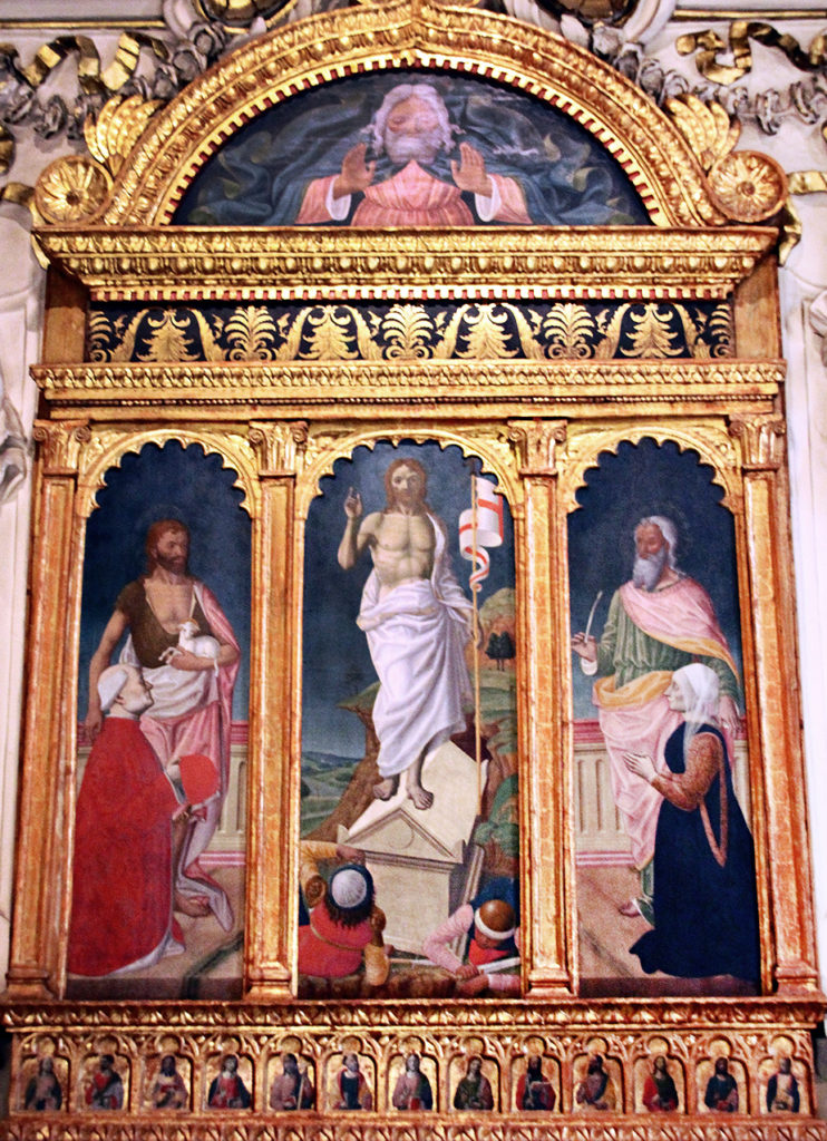 Ambrogio Bevilacqua, trittico della Resurrezione con S, Giovanni Battista e un evangelista e i committenti. XV sec.
