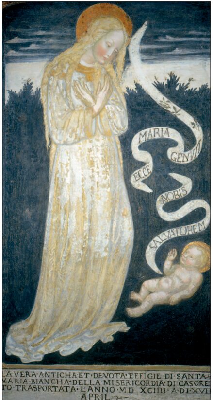Ma la testimonianza forse più tipica è la sacra effige che rimanda direttamente alla “Madonna Bianca” a cui è dedicato il complesso abbaziale. Di altre devozioni mariane erano titolari le vicine chiese di S. Maria Nera di Loreto (non più esistente) e di S. Maria Rossa di Crescenzago, questa invece ancora incastonata nell’antico abitato lungo il Naviglio Martesana. Un altare novecentesco accoglie la raffinata immagine di una giovanissima madre di Gesù adorante il Bambino appena nato. La guida della parrocchia correttamente descrive l’affresco, trasportato in chiesa dall’annesso convento nell’aprile del 1593, come risalente al quinto decennio del XV secolo, suggerendo un ambito culturale collegato all’attività degli Zavattari. L’iconografia esemplifica quel passo delle Revelationes di S. Brigida di Svezia in cui la mistica medievale descrive il mistero del parto verginale di Maria, così improvviso e istantaneo, da essere reso evidente alla madre soltanto dalla visione “dello splendidissimo e glorioso Bambino” giacente sulla nuda terra, esattamente come rappresentato in questa pittura.