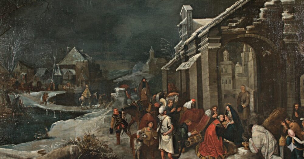 Adorazione dei Magi in un paesaggio nevoso, anonimo maestro fiammingo, olio su tela, XVII sec.